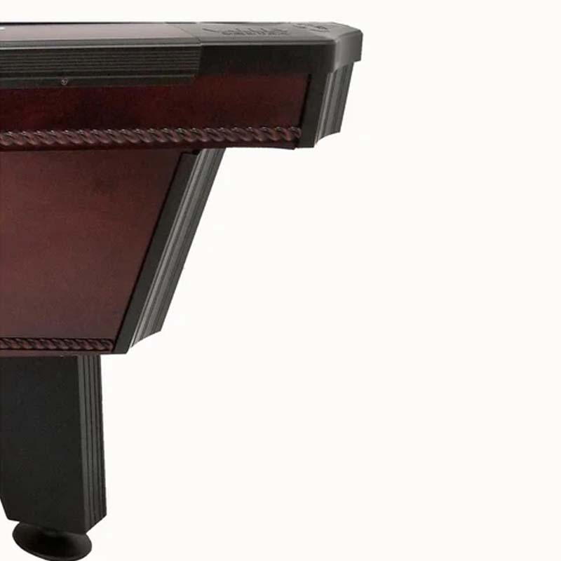 The table features a mahogany laminate cabinet finish with contrasting corner castings and metal accent components.